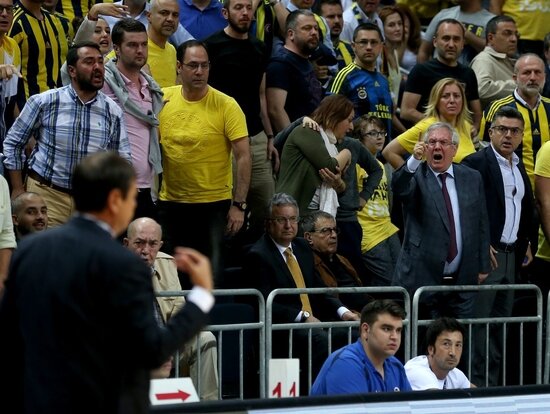 Sarı-lacivertlilerin 93-79 kazandığı mücadelenin ilk yarısında Ergin Ataman'ın maçın hakemine itiraz ettiği anlarda, Aziz Yıldırım da oturduğu yerden fırladı. Fenerbahçe Başkanı, Ergin Ataman'a tepki gösterdi ve bu an objektiflere yakalandı.