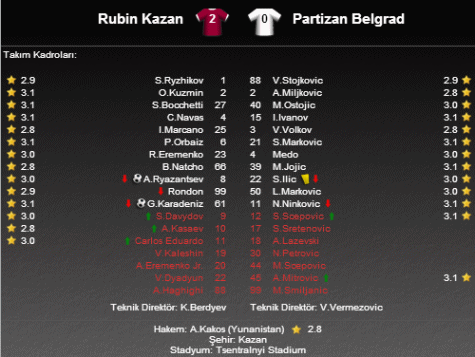 UEFA Avrupa Ligi'nde H Grubu'nda ikinci hafta maçında temsilcimiz Gökdeniz Karadeniz'in formasını giydiği Rus ekibi Rubin Kazan ile Sırbistan ekibi Partizan karşı karşıya geldi. Rusya'da oynanan maçta gülen taraf 2-0'lık skorla ev sahibi Rubin Kazan oldu.