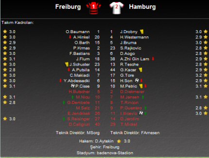 Freiburg ikinci yarının hemen başında beraberliği yakaladı. Ev sahibi ekibin golcü oyuncusu Papiss Cisse 47. dakikada beraberlik golünü atarken, milli oyuncumuz Gökhan Töre'nin asistinde oyuna 66. dakikada İvico İlicevic 74. dakikada Hamburg'a 3 puanı kazandıran golü attı. Freiburg'ta ilk golün sahibi olan Papiss Cisse 81. dakikada bir penaltıdan yararlanamayınca, karşılaşma 2-1'lik Hamburg galibiyeti ile sona erdi.Haftaya son sırada giren Hamburg bu galibiyet ile puanını 7'ye çıkartarak puanını Freiburg ile eşitledi. Hamburg 10. haftada Wolfsburg'u ağırlarken, Freiburg Kaiserslautern'e konuk olacak.
