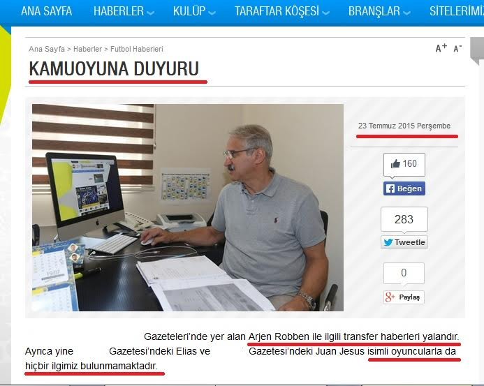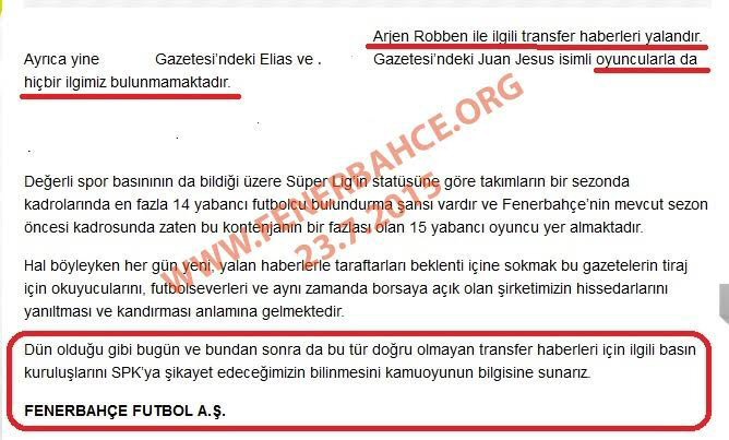 Sportif direktör Terraneo'nun Robben ile görüştüğü ve transfer teklifinde bulunduğu iddiası aynı günler Fenerbahçe resmi istesi tarafından şiddetle yalanlanmış ve medyayı halka açık şirke olmasından dolayı medyayı SPK ile tehdit etmişti.