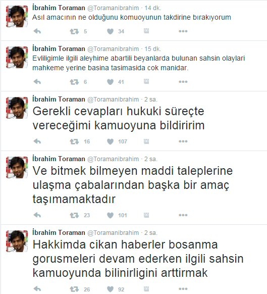 Geçtiğimiz gün açıklama yapan İbrahim Toraman, ayrılık haberlerini doğrulamış ancak eşine şiddet uyguladığı iddialarını yalanlamıştı. “Şiddet diye bir şey söz konusu değil. Hanımefendinin Almanya’ya yerleşmek istemesiyle bizim ilişkimiz son buldu. Oraya yerleşmeyeceğim için yolları ayırma kararı aldık” diyen futbolcunun açıklaması eşi Eylem Toraman’ın avukatı Nazmi Zengin tarafından yalanlandı. Eylem Toraman’ın darp edildikten sonra çekilen fotoğrafları kanıt olarak sunan Zengin, müvekkilinin Almanya’da değil, İstanbul’da yaşadığını belirtti.
