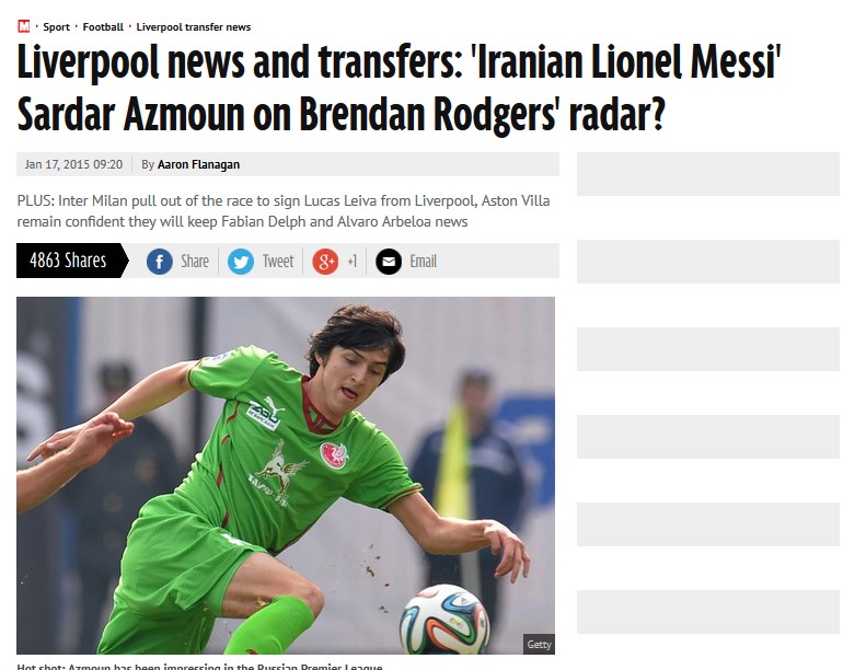 ''İranlı Messi'' olarak tanınan Rubin Kazan forması giyen SardarAzmoun için Liverpool ve Tottenham'ın devreye girdiği iddia edildi. Ada basını Rubin Kazan'daki başarılı performansıyla dikkat çeken Sardar Azmoun için Liverpool'un 5 milyon poundu gözden çıkardığını iddia etti. Tottenham'ın da ilgilendiği belirtilen genç oyuncu için Rubin Kazan cephesinden de kısa bir açıklama geldi.