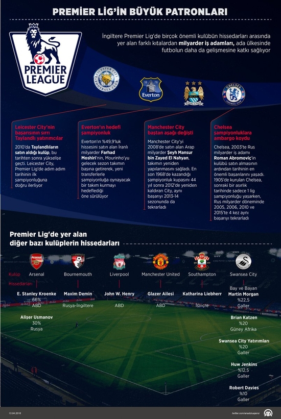 Bu sezon şampiyonluğun en önemli adayı arasında yer alan Leicester City'nin yanı sıra Everton, Arsenal, Manchester City ve Chelsea gibi ligin başat takımlarının başarısının arkasında Asya ve Doğu Avrupa kökenli milyarder iş adamlarının yatırımları yatıyor.