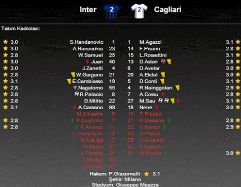 İtalya Ligi'nde 13. hafta maçında Inter ile Cagliari karşı karşıya geldi. Giuseppe Meazza'da oynanan maç 2-2'lik beraberlikle sona erdi.