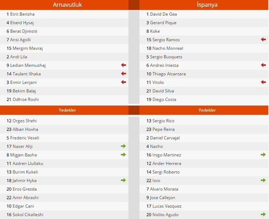 Arnavutluk'un ev sahibi olduğu maçta İspanya'ya galibiyeti getiren golleri 55. dakikada Diego Costa ve 63. dakikada Nolito kaydetti.