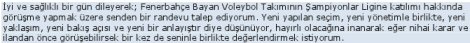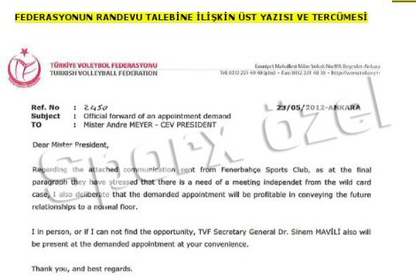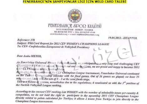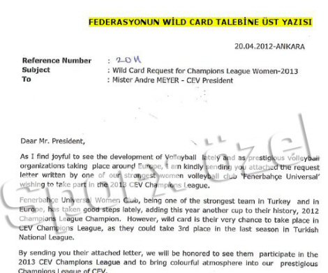 "Sayın Başkan, Voleybolun son zamanlardaki hamlelerinden özellikle sevinç duyarak; en güçlü kulüplerimizden biri olarak 2013 Şampiyonlar Liginde yer almak isteyen Fenerbahçe Universal'in talep mektubunu arz ediyorum. Fenerbahçe UNiversal Bayan Takımı, Türkiye'nin ve Avrupa'nın en güçlü takımlarından biri olarak, son zamanlarda attığı büyük adımlara, bu yıl 2012 Şampiyonlar Ligi Şampiyonluğunu da ilave ederek bu kupayı da tarihine katmıştır. Size ekteki mektuplarını ileterek; 2013 Şampiyonlar Liginde onları ve prestijli Şampiyonlar Ligimize getirecekleri renkli atmosferi görmekten onur duyacağımızı bildirmek istiyorum. Son olarak; önceki yıllarda birçok CEV Kupasına katılarak Avrupanın starlarına karşı büyük performans gösteren bu kulübümüzün talebinin yerine getirilmesini saygılarımla arz ediyorum."