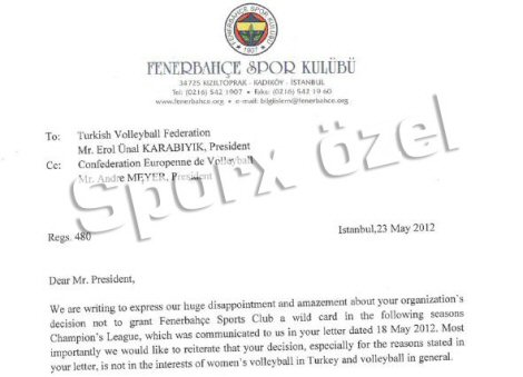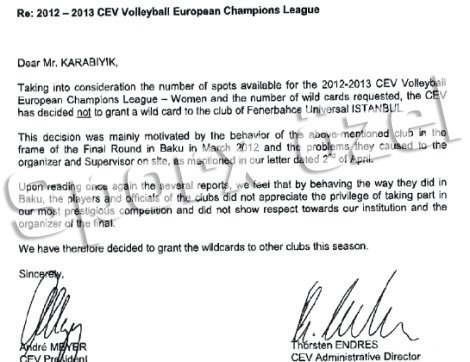 "Sayın KARABIYIK, 2012-2013 CEV Voleybol Avrupa Şampiyonlar Ligi-Bayan katılımcı takımların sayıları ve talep edilen wild card başvurularını göz önüne aldığımızda CEV, Fenerbahçe Universal İstanbul Kulübüne wild kart vermeme kararı almıştır. 2 Nisan tarihli mektubumuzda da belirtildiği gibi, Mart 2012’de Bakü’de yapılan Final Etabında yukarıda adı geçen kulübün sergilediği davranışlar ve yine orada gerek Süpervizöre gerek organizatöre karşı çıkardıkları problemler bu kararın verilmesindeki en önemli etken olmuştur. Elimize geçen raporları incelediğimizde Bakü’de gösterdikleri davranışlarla en saygın müsabakamızda yer almanın ayrıcalığını takdir etmeyip kurumumuza ve final organizatörüne gereken saygıyı göstermedikleri kanısına vardık. Bundan dolayı bu sezon wild card imtiyazını diğer kulüplere kullanma kararı aldık. Saygılarımızla"
