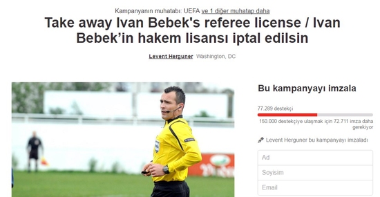 Sarı-lacivertli taraftarlar, imza toplama sitesi change.org üzerinden başlattıkları kampanya ile Hırvat hakemin lisansının iptal edilmesini talep etti.