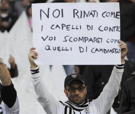 Juventus-Inter maçında ev sahibi taraftarlar rakiple dalga geçen pankartlar da açtılar. Bunlardan en ilginci; saç ektiren Juventus Teknik Direktörü Antonio Conte'ye vurgu yapan, "Biz Conte'nin saçları gibi yeniden doğduk. Siz ise Cambiasso'nunkiler gibi kayboluyorsunuz"du.