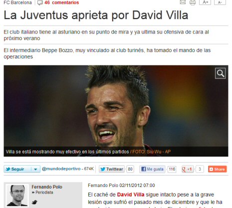 Yıldız bir golcüyü takıma kazandırmak isteyen Juventuslu yetkililerin son hamlesi David Villa oldu. Golcü oyuncuyu 2012-2013 sezonu sonunda transfer etmenin planlarını yapan Juventus, listenin ilk sırasına İspanyol oyuncuyu koydu.Geçirdiği ağır sakatlığın ardından eski formunu kaybeden ve Katalan temsilcisinde forma giymekte zorluk çeken David Villa konusunda yakın ilişkilerden yararlanmak isteyen Çizme ekibi, bu transfere nokta koymak için çabalayacak.