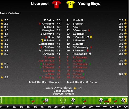 Liverpool bu skorla puanını 7'ye çıkartarak 2.sırada tur umudunu son maça bıraktı, Young Boys da 7 puanla 3. sırada bulunarak tur şansını korudu.İlk yarıda Liverpool Shelvey ile perdeyi açtı. Joe Cole'un ortasında kafayı vuran oyuncu topu filelere göndererek durumu Kırmızılar lehine 1-0'a getirdi. İlk yarıda başka gol olmazken, soyunma odalarına 1-0 Liverpool üstünlüğüyle gidildi.