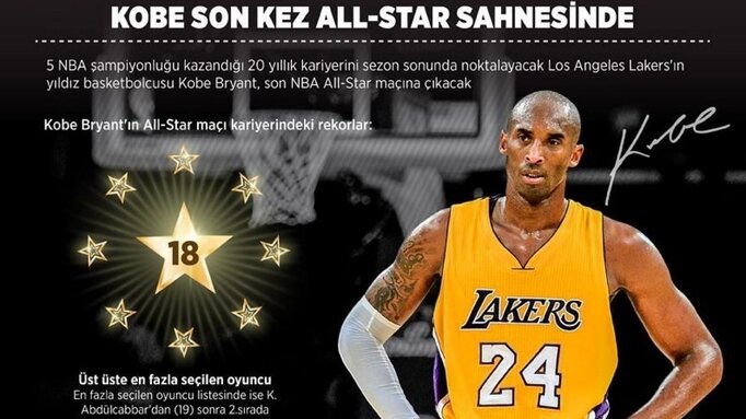 Lakers'ta geçirdiği 20 sezonla "bir NBA takımının formasını en uzun süre giyen basketbolcu" unvanının sahibi 37 yaşındaki Bryant'ın, son defa boy göstereceği 65. NBA All-Star maçı, 15 Şubat'ta TSİ sabaha karşı 03.30'da Kanada'nın Toronto kentinde yapılacak.Aralıksız 18 kez all-star seçilerek bu alandaki rekoru elinde tutan Bryant, "NBA tarihinin en fazla all-star seçilen oyuncuları" listesinde 19 ile zirvede yer alan Kerim Abdülcabbar'ın arkasında 2. sırada bulunuyor.