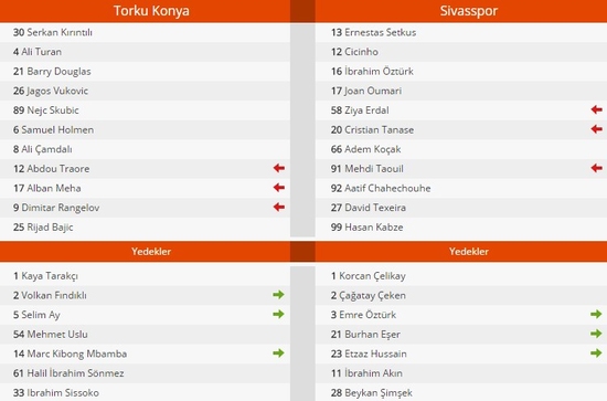 Torku Konyaspor: Serkan Kırıntılı, Skubic, Ali Turan, Vukovic, Douglas, Ali Çamdalı, Holmen, Meha (Dk. 90 Selim Ay), Traore (Dk. 65 Mbamba), Rangelov (Dk. 74 Volkan Fındıklı), Bajic