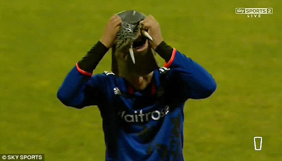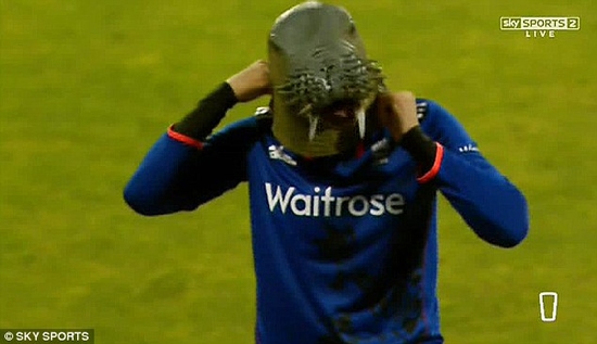 İngiliz oyuncu Alex Hales, tribünlerden atılan deniz aygırı maskesini aldı ve maskeyi yüzüne geçirerek tribünlere kadar gitti.