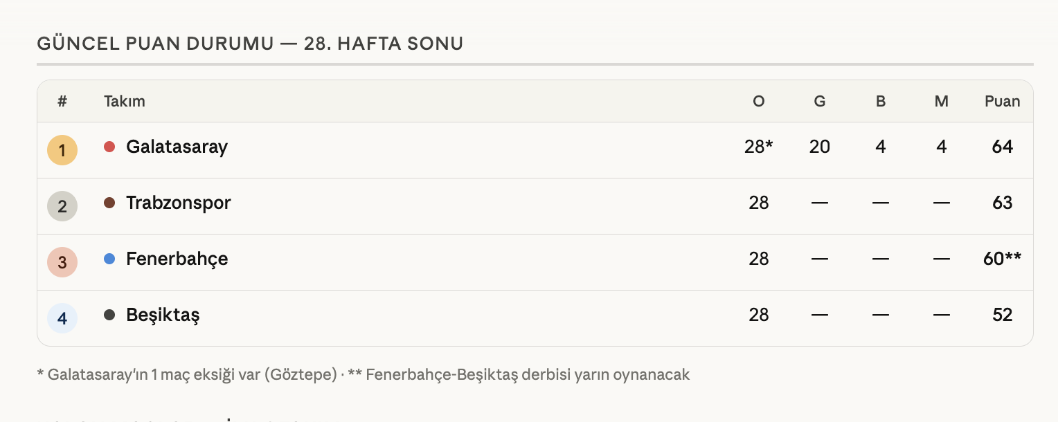 Sezonun son 6 haftasının en belirleyici randevusu ise RAMS Park'ta oynanacak olan Galatasaray - Fenerbahçe derbisi. O güne kadar hangi takımın hangi puanda bulunduğu, şampiyonluğun kaderini doğrudan etkileyecek.