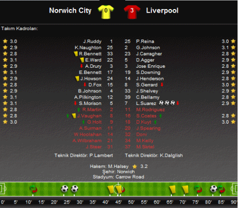 Maç boyunca etkili bir futbol oynayan Liverpool'un, 52. dakikada Jonjo Shelvey ile bir topu da direkten döndü.Bu sonuçla Liverpool, puanını 49'a çıkarttı. Norwich City ise 43 puanda kaldı.