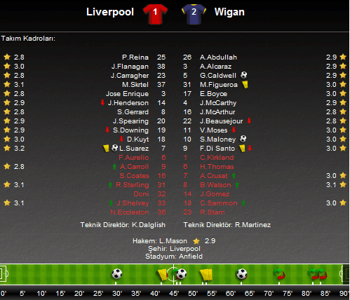 Mücadelenin 30. dakikasında Martin Skertel'ın sebep olduğu penaltıyı Wigan'da Shaun Maloney gole çevirince konuk ekip ilk yarıyı 1-0 önde kapattı. İkinci yarının hemen başında Luis Suarez ile eşitliği sağlan Liverpool, 63. dakikada Gary Caldwell'in golüne engel olamayınca sahadan 2-1 yenik ayrıldı.