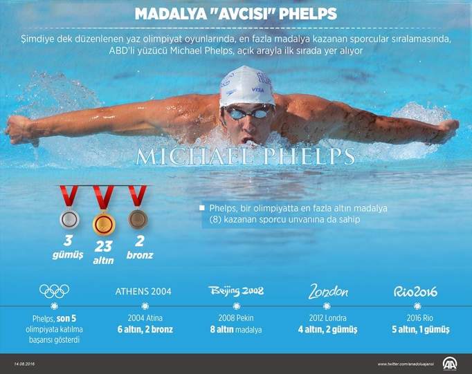 Son 5 olimpiyata katılma başarısı gösteren Phelps, 23 altın, 3 gümüş ve 2 bronz madalyayla Yaz Olimpiyat Oyunları'nın en çok kürsüye çıkan ismi oldu.