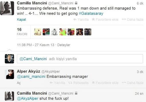 Roberto Mancini'nin kızı Camilla Mancini'nin bir taraftarla girdiği laf dalaşı dikkatleri çekti. Galatasaray'ın Real Madrid'e 4-1 yenildiği mücadelede Camilla olay yarattı.