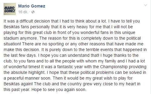 "Bu kararı vermek çok zordu. Beşiktaş taraftarına benim için çok zor kararımı açıklamak zorundayım. Artık bu eşsiz statta harika taraftarlar ve harika kulüpte oynamayacağım. Kararımın sebebi tamamen politiktir. Bu kararı vermemde sportif veya başka sebepler yoktur. Son günlerde dehşet verici olaylar yaşandı. Umuyorum ki bu kararımı anlayabilirsiniz. Burada yaşadığım harika zamanlar için kulübe ve mükemmel taraftara teşekkür ederim. Politik problemlerin en yakın zamanda barış içinde çözülmesini diliyorum. O zaman yeniden Beşiktaş'ta oynamayı isterim. Geçtiğimiz sene bu şehir ve bu kulüp kalbime çok yakındı. Tekrar görüşmek dileğiyle."