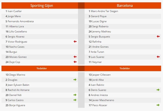 Barceona'ya galibiyeti getiren goller, 29. dakikada Suarez, 32. dakikada Rafinha, 81. ve 88. dakikalarda Neymar ile 85. dakikada milli yıldızımız Arda Turan'dan geldi. Gijon'da Alberto Lora, 74. dakikada kırmızı kart görerek oyun dışında kaldı. Messi'nin sakatlığının ardından ilk 11'de şans bulan Arda Turan ayrıca, ilk golde Suarez'e asisti yapan da isim oldu.