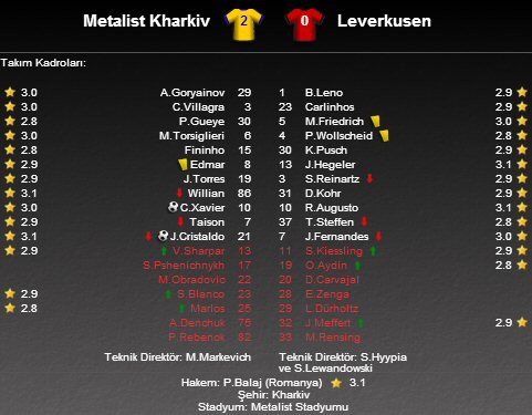 UEFA Avrupa Ligi K Grubu'nda Ukrayna temsilcisi Metalist Kharkiv, Metalist Stadyumu'nda Alman takımı Bayer Leverkusen'i konuk etti. Mücadeleden Metalist Kharkiv 2-0 galip ayrılmayı başardı.