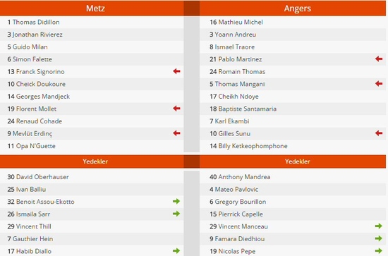 Ev sagibi Metz'de milli futbolcumuz Mevlüt Erdinç, maça 11'de başladı. Mevlüt yerini 69. dakikada Habibou Mouhamadou Diallo'ya bıraktı.