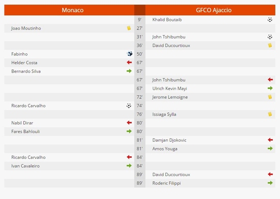 Khalid Boutaib'in 9. dakikada attığı golle öne geçen Ajaccio'da John Tshibumbu Lungeny, 31'de farkı ikiye çıkardı ve ilk devre bu şekilde tamamlandı. 51'de Fabinho skoru 2-1'e getirirken, 73'te Ricardo Carvalho tabelayı belirledi.