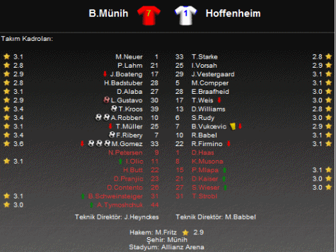 Bu sonucun ardından Bayern Münih ligdeki puanını 51 yaptı ve ikinci sırada yer alarak lider Borussia Dortmund'u takibini sürdürdü. Hoffenheim ise 30 puanda kaldı. Münih ekibi gelecek hafta deplasmanda Hertha Berlin deplasmanına konuk olurken Hoffenheim sahasında Stuttgart'ı ağırlayacak.