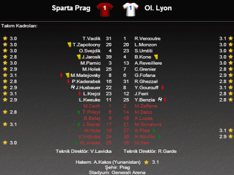 UEFA Avrupa Ligi I Grubu'nda Çek Cumhuriyeti temsilcisi Sparta prag ile Fransız ekibi Lyon karşı karşıya geldi. General Arena'da oynanan maç 1-1'lik eşitlikle sona erdi.