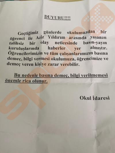 Dağıtılan bildiride "Geçtiğimiz günlerde okulumuzda bir öğrenci ile Aziz Yıldırım arasında yaşanan talihsiz bir olay neticesinde basın-yayın kuruluşlarında haberler yer almıştır. Öğrencilerimizin ve tüm çalışanlarımızın basına demeç, bilgi vermesi okulumuza, öğrencimize ve demeç veren kişiye zarar verebilir. Bu nedenle basına demeç, bilgi verilmemesi önemle rica olunur" ifadeleri kullanıldı.