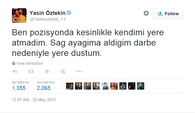 Tartışmalara neden olan penaltı pozisyonu hakkında kendisine ait twitter hesabından açıklama yapan Yasin; "Ben pozisyonda kesinlikle kendimi yere atmadım. Sağ ayağıma aldığım darbe nedeniyle yere düştüm. Hayatım boyunca haksız kazanç aramadım. Zaten Allah da bana böyle bir kazancı asla nasip etmesin. Allah şahidimdir" ifadelerini kullandı.