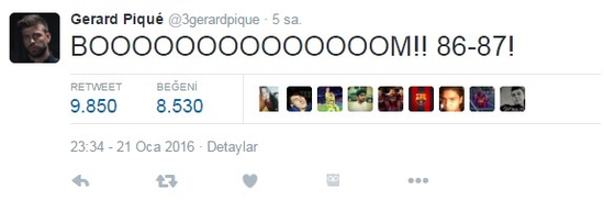 Real Madrid aleyhine yaptığı paylaşımlarla İspanya'da ortamın gerilmesine sebep olduğu yönünde eleştiriler alan Pique, Justin Doellman'ın son saniye basketinin ardından Barcelona Lassa'nın maçı 87-86 kazanmasına atıfta bulunarak "BOOOOOOOOOOOOOOM!! 86-87!" mesajı paylaştı. Bu tweet kısa sürede binlerce kez alıntılandı.
