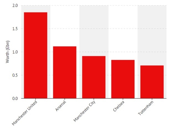 İngiliz finans uzmanı Dr. Tom Markham'ın araştırmasına göre Manchester United, 2.6 milyar euroluk piyasa değeriyle zirvede yer alıor. Arsenal ve Manchester City ise ikinci ve üçüncü sıralarda. En alt sırada ise 146 milyon euroluk değeriyle Bournemouth var.