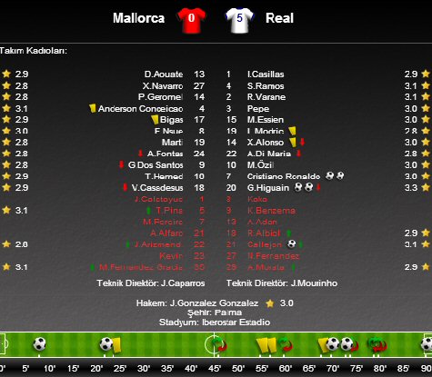 İspanya 1. Ligi La Liga'nın 9. haftasında Real Madrid Mallroca deplasmanına konuk oldu. Madrid ekibinin maç boyunca üstünlüğünü koruduğu karşılaşmada Los Galacticos 5 - 0 sahadan galip ayrıldı. Konuk ekibin gollerini 8 ve 70'te Higuain, 22 ve 73'te Ronaldo ve 90 + 1'de Callejon kaydetti.