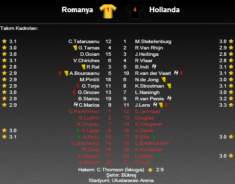 Karşılaşmada Hollanda'ya galibiyeti getiren golleri 9. dakikada Lens, 29. dakikada Bruno Martins Indi, 45'te penaltıdan Rafael Van der Vaart ve 86. dakikada Van Persie kaydetti. Romanya'nın tek sayısı 40. dakikada Ciprian Marica'dan gelirken bu gol teselliden öteye gidemedi.