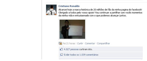 Real Madrid'in gözbebeği sosyal ağlardan Facebook'taki hayran sayfasında kişi sayısının 20 milyonu devirmesi üzerine ilginç bir resim paylaştı. Ronaldo üzerinde "20 milyon" yazan bir kağıtı kameraya tutarken Real Madrid'in ezeli rakibi Barcelona'ya bir mesaj yolladı.