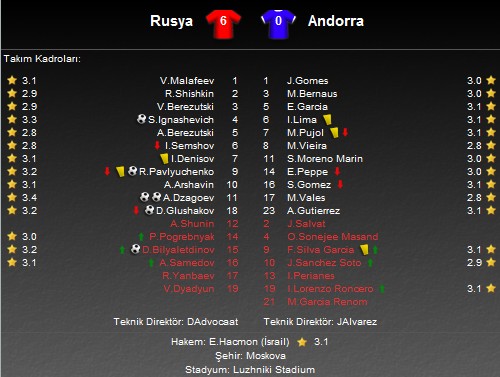 B Grubu'nda İrlanda ile grup birinciliği mücadelesi veren Rusya için İrlanda'nın Ermenistan'ı 2-1 mağlup ettiği günde, Andorra karşısında alınacak galibiyet çok önemliydi.
