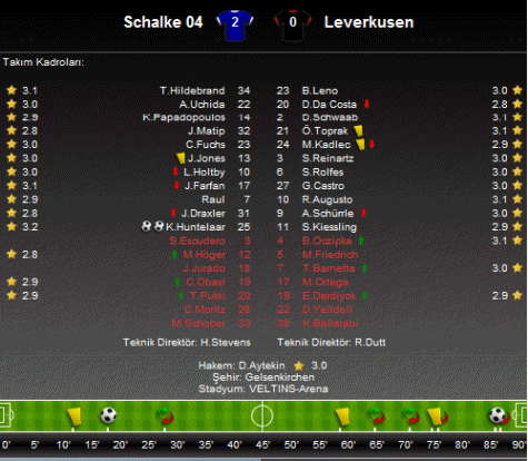 Almanya Ligi'nde 27. hafta mücadelesinde Schalke 04 ile Bayer Levekursen karşı karşıya geldi. Veltins Arena'da oynanan maçta gülen taraf 2-0'lık skorla ev sahibi ekip Schalke 04 oldu.