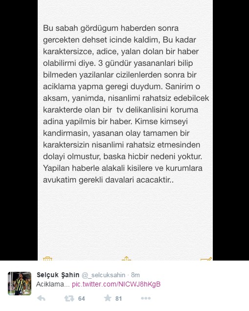 Mikroblog sitesi twitter üzerinde bulunan resmi hesabından söz konusu duruma açıklık getiren Selçuk Şahin, bahsi geçen tatsız olayın yalnızca İbrahim Çelikkol'un nişanlısını rahatsız etmesinden kaynaklandığını ve başka bir sebebi olmadığını söyledi.