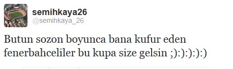 Mikro blog sitesi twitter'daki hesabı üzerinden bir mesaj gönderen genç futbolcu, "Bütün sezon boyunca bana küfür eden Fenerbahçeliler bu kupa size gelsin ;) :):):):)" dedi.