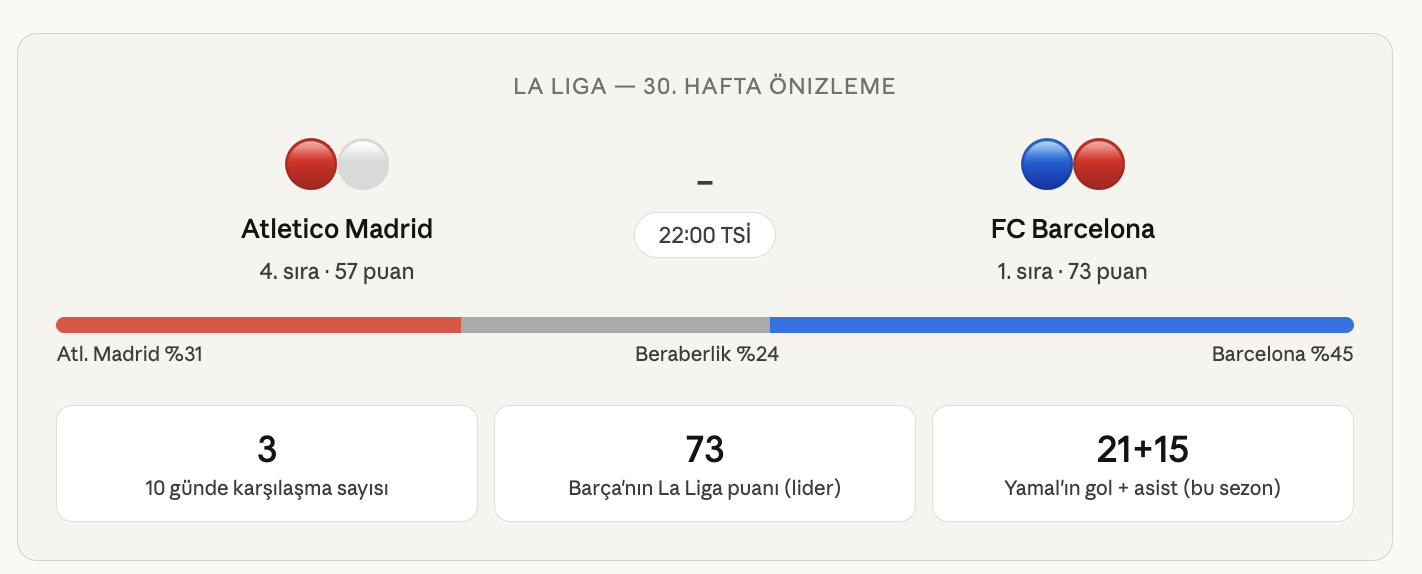 Futbol takviminin bu haftaki yoğunluğu dikkat çekici: İki ekip bu hafta sonu La Liga'da karşılaşacak, ardından 8 Nisan'da Camp Nou'da ve 14 Nisan'da yeniden Metropolitano'da Şampiyonlar Ligi çeyrek final maçlarına çıkacak. Bu nedenle bugünkü mücadele yalnızca bir lig maçı değil, aynı zamanda Avrupa'daki serinin psikolojik başlangıcı olarak görülüyor.