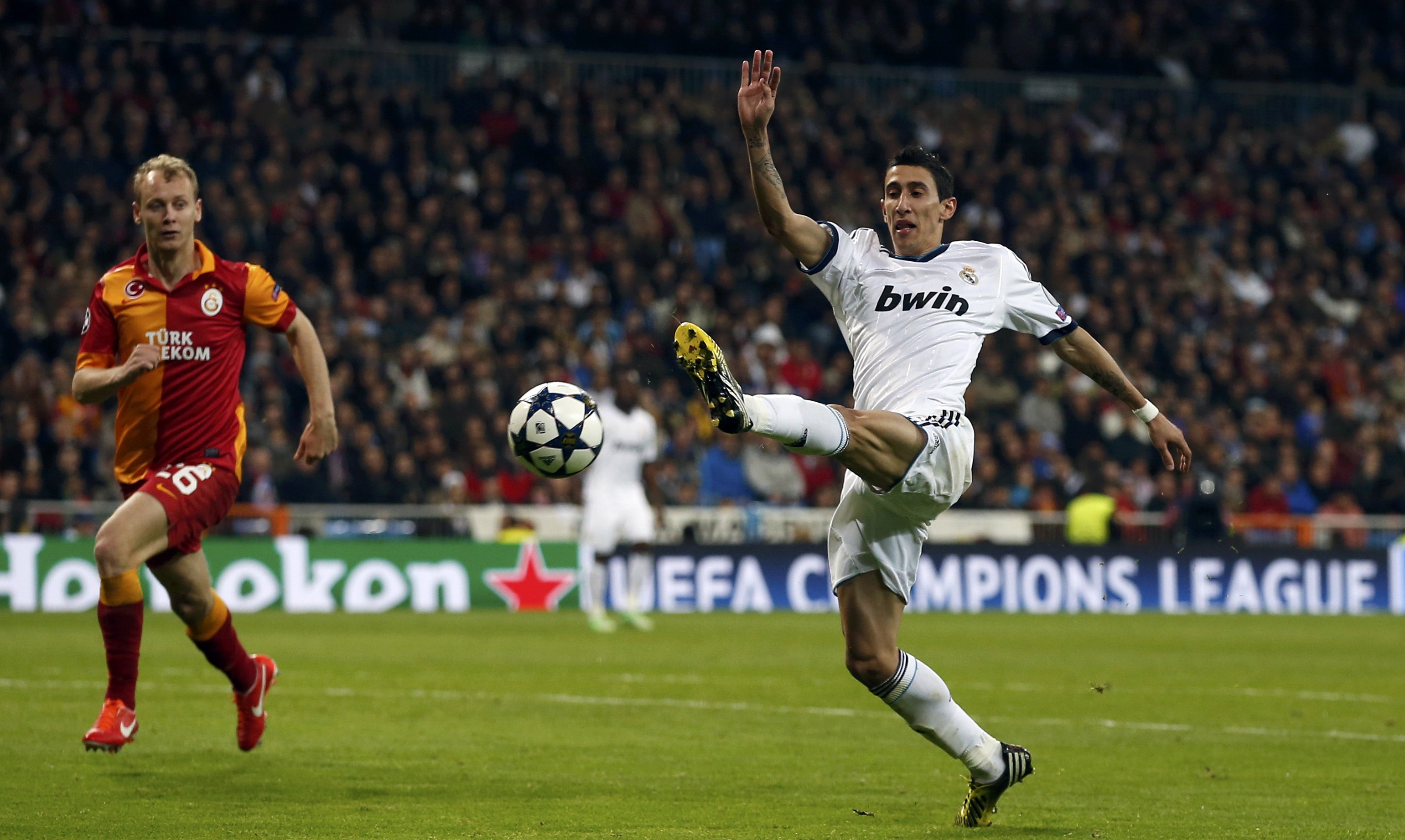 Real Madrid'in mücadeleye hızlı ve rahat başladığı görülürken, sarı-kırmızılılar daha biraz tutuk göründü. Los Galacticos Di Maria'nın sağdan ortasında Benzema ile pozisyon bulurken, Galatasaray kaleye ilk şutunu ceza sahası dışından Felipe Melo ile çekti. İki atak da tehlike yaratmaktan uzaktı.