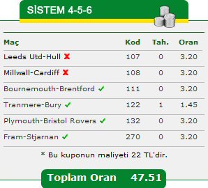 Hafta içi bülteninde en yüksek oranlı üçüncü tahminimiz Esat Dergi'den geldi. Sistem kuponunda Fram - Stjarnan, Plymouth - Bristol ve Bournemouth - Brentford maçlarını doğru tahmin eden tahmincimiz, Millwall - Cardiff ve Leeds - Hull müsabakalarında yanıldı.