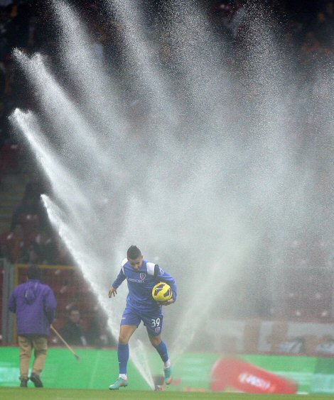 Öte yandan Türk Telekom Arena'da olası bir yağmur durumuna karşı zemine dökülen kum, yağış olmayınca büyük sıkıntı yarattı. Stat görevlilileri de çareyi zemini sulamakta buldu. Futbol Federasyonu yetkililerinden alınan özel izinle Karabük maçının devre arasında saha fıskiyelerle sulandı. Ancak durumdan habersiz olan Semih Kaya ve Riera gafil avlandı. İki oyuncu soyunma odasına giderken sırıl sıklam oldu.