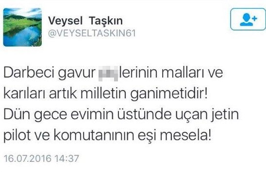 || Son güncellemeTrabzonspor Basketbol Takımı, 2. Başkanı Veysel Taşkın, darbeci askerlerin eşlerinin milletin ganimeti olduğunu söylediği tweeti sonrası istifa ettiğini açıkladı.