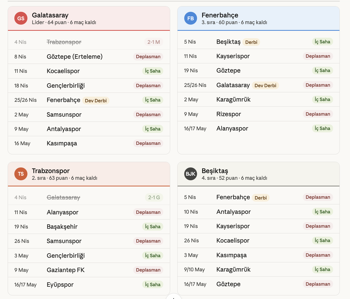 Ligde kalan maçlar;