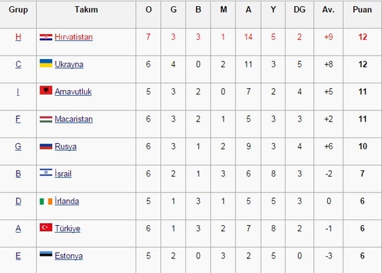 Türkiye 6 Eylül 2015 tarihli maç sonuçlarına göre grup üçüncüleri listesinde 6.basamakta yer alıyor. A Milli takım kalan iki maçını kazanması sadece 3.sırayı korumanın yanında üçüncüler listesindeki yer içinde önemli.