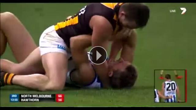 Hawthorn forması giyen Brian Lake ikili mücadele sonrasında North Melbourne oyuncusu Drew Petrie'nin boğazına yapıştı ve rakibinin üzerine yüklendi.
