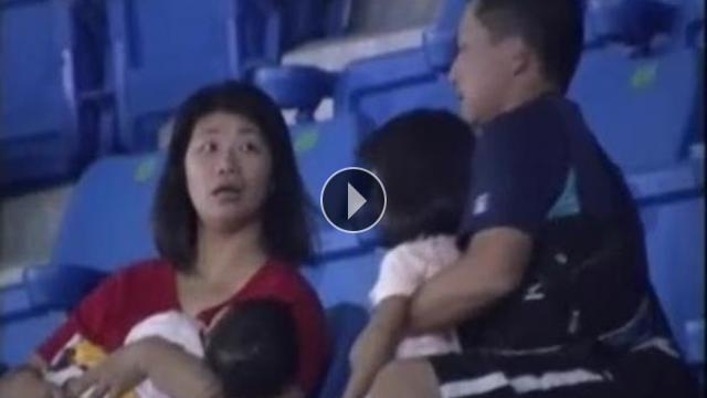 Taiwan'da bir beyzbol taraftarı kucağında kızı varken topu tutmak isteyince kızını düşürdü. Eşi tarafından azarlanan taraftar, durumu eşine anlatmak için büyük bir mücadele verdi.